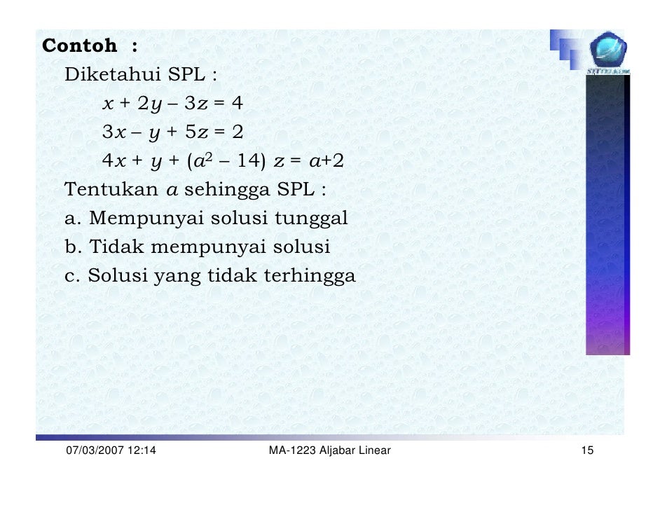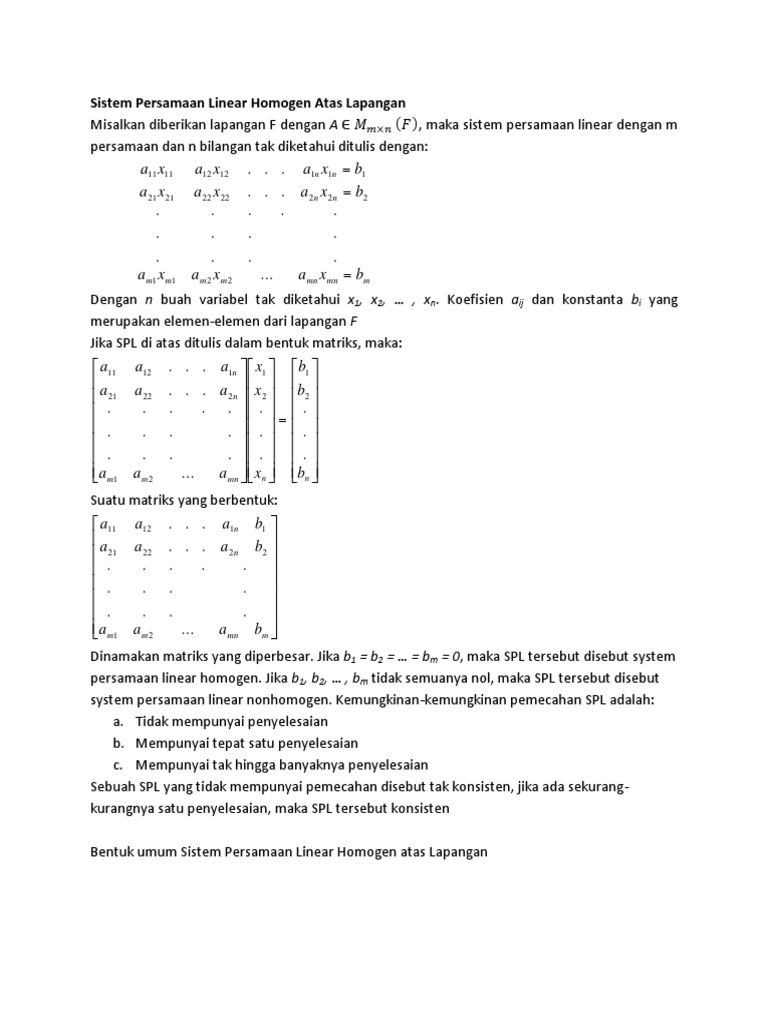 Persamaan Linear Homogen. Spl homogen ini mempunyai dua kemungkinan solusi, yaitu solusi trivial dan non trivial. Pembahasan spl homogen 3 variabel pdf yang terdiri dari:
