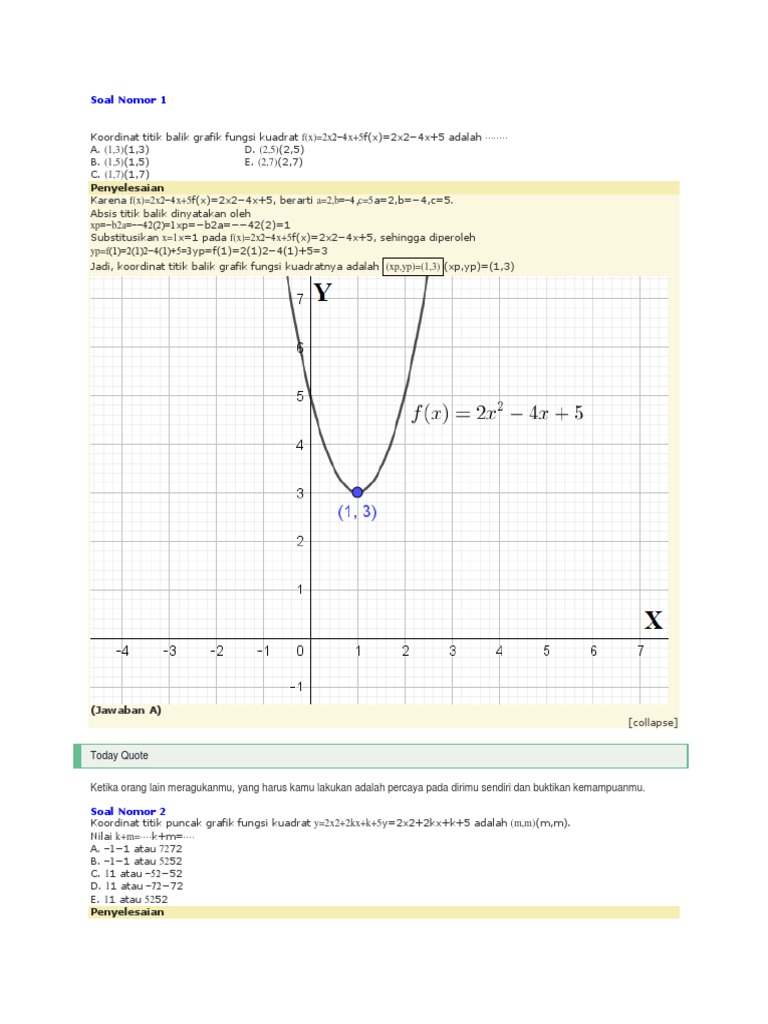 Tutorial Cara Menentukan Titik Puncak Grafik Fungsi Kuadrat Bagian 3 Youtube from i.ytimg.com Grafik dari fungsi kuadrat berbentuk seperti parabola sehingga sering disebut grafik parabola. Dalam fungsi orang tua, y = x 2 , sebuah = 1 (karena koefisien dari x adalah 1). Ya, sesuai namanya, fungsi kuadrat merupakan suatu fungsi di mana pangkat tertinggi dari jika 𝑓 𝑥 = 𝑥2 − 𝑏𝑥 + 7 puncaknya berabsis 4, maka ordinatnya adalah… contoh 2: