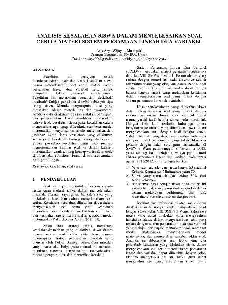 Analisis Kemampuan Berpikir Reflektif Dalam Menyelesaikan Soal Cerita Matematika Subpokok Bahasan Sistem Persamaan Linear Dua Variabel Siswa Kelas X Pembangkit Listrik Pbl Smk Negeri 2 Jember from data03.123dok.com Dalam beberapa contoh soal nantinya, terdapat soal berupa alur cerita yang menuntut kita harus dapat memodelkan soal cerita tersebut dalam bentuk persamaan linear. Perhatikan dan pelajari pembahasan sistem persamaan linear dua variabel (spldv) soal cerita yang berikut. Untuk menyelesaikan soal cerita program linear, dibutuhkan kemampuan analisis yang lebih tinggi dibanding soal program linear yang biasa.
