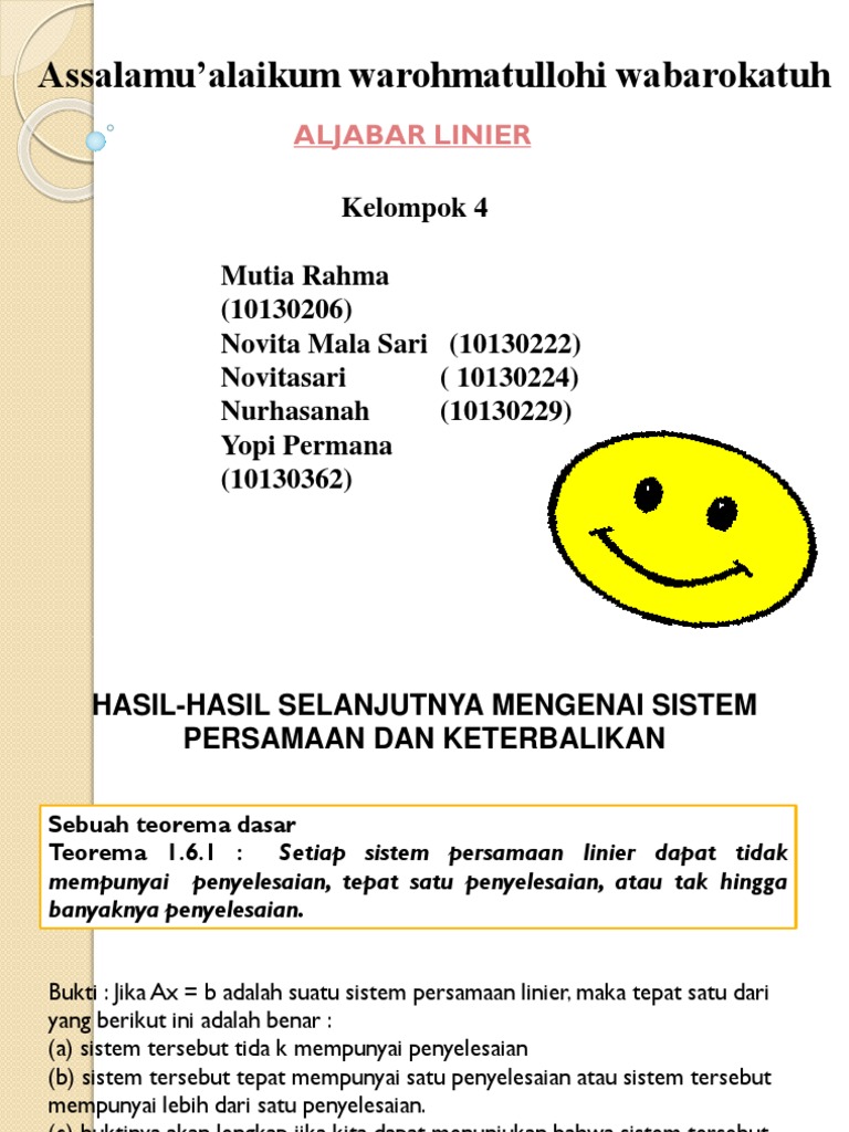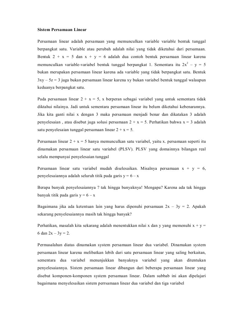 Sistem Persamaan Linear from imgv2-1-f.scribdassets.com Persamaan linear satu variabel berarti dalam sistem persamaan tersebut hanya terdapat satu variabel saja. Sistem persamaan linear bermanfaat untuk menentukan koordinat titik potong. Apa sih sistem persamaan linear dua variabel itu?