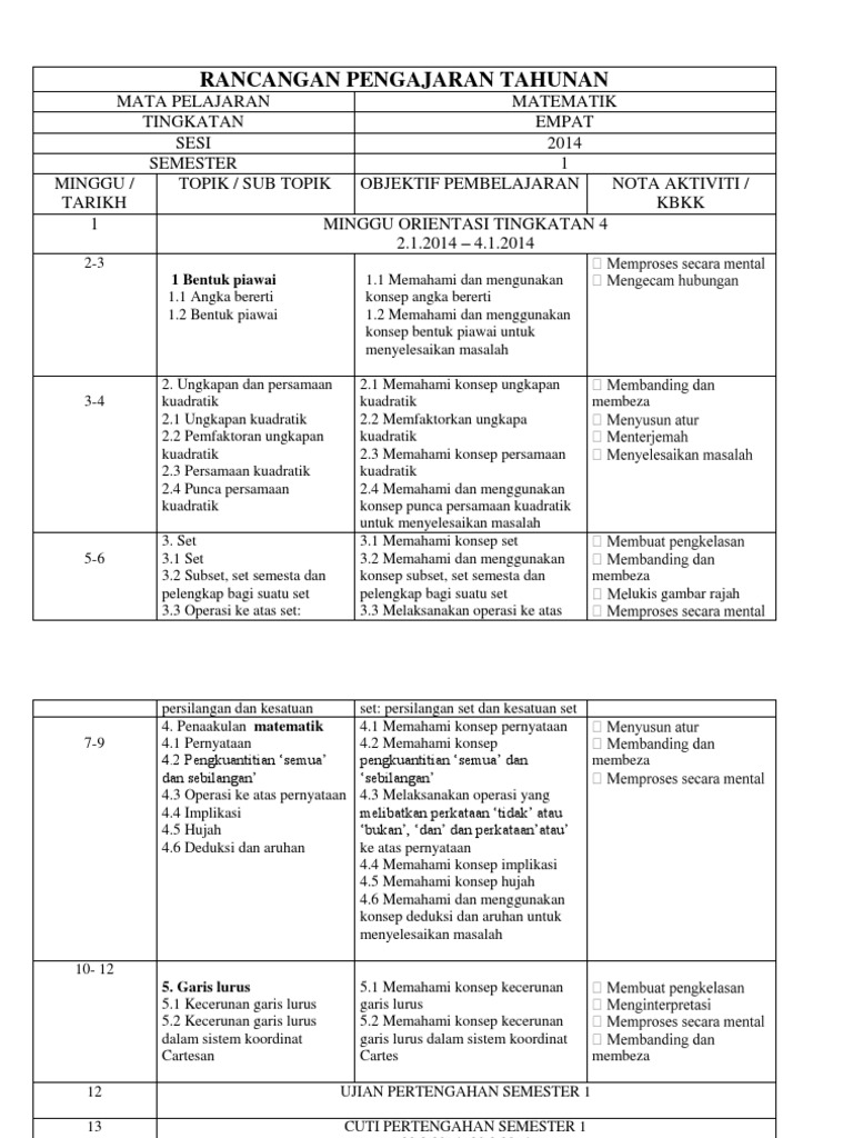 Rancangan Pengajaran Tahunan 2014 Matematik Tingkatan 4 from imgv2-1-f.scribdassets.com Bentuk piawai ungkapan dan persamaan kuadratik set penaakulan matematik garis lurus statistik iii kebarangkalian i bulatan iii trigonometri ii sudut dongakan dan sudut tunduk garis dan satah dalam tiga matra. Persamaan kuadratik kalau ada section yang tidak paham, komen saja di bawah, i will. Rancangan pengajaran tahunan tingkatan 4 matematik 2016 sal/2 2.