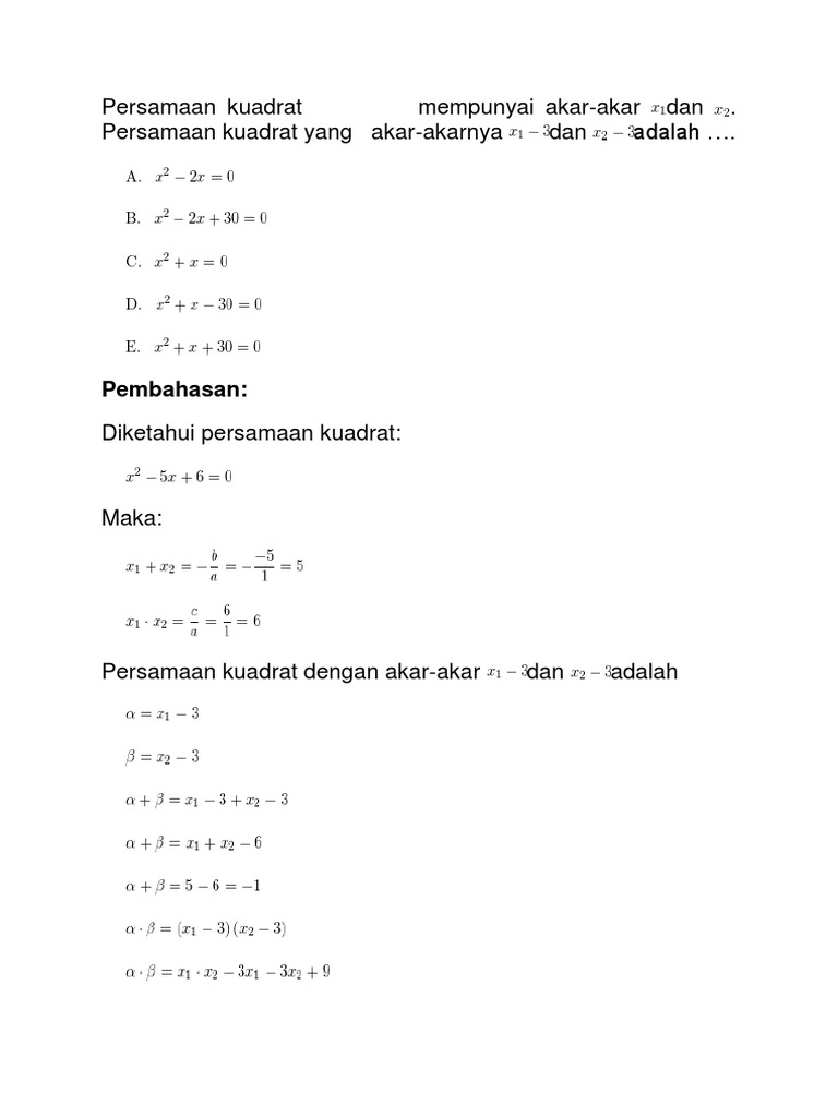 Contoh Soal Persamaan Kuadrat Yang Mempunyai Akar Akar. Persamaan kuadrat memiliki bentuk umum. Persamaan kuadrat adalah persamaan yang hanya memuat satu peubah atau variabel dan pangkat tertinggi dari variabel tersebut adalah 2.
