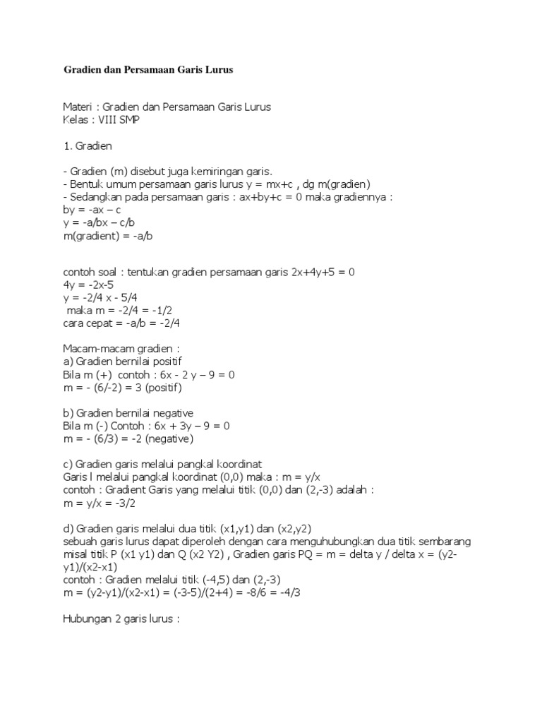 Persamaan Garis Lurus Bergradien. Persamaan nya yaitu sebagai berikut Silahkan anda tentukan persamaan dari sebuah garis lurus yang melalui titik pusat ( 0 , 0 ) dan bergradien 2.