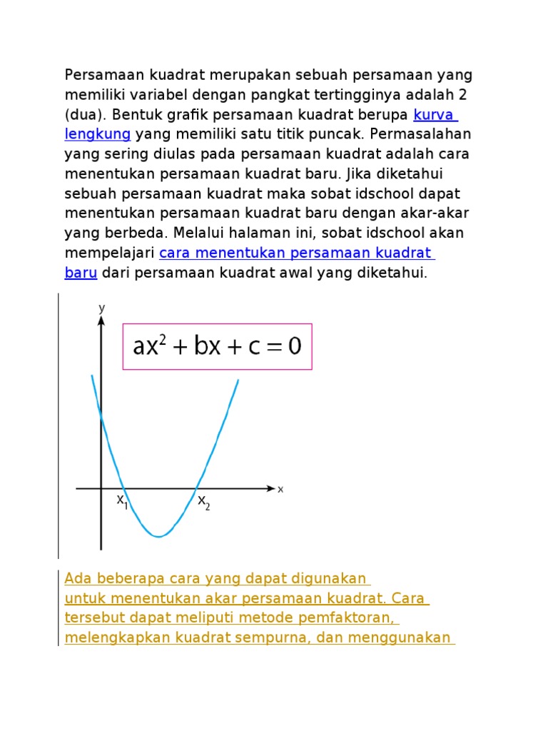 Persamaan Kuadrat Baru Yang Memiliki Akar Akar. Dengan a, b, merupakan koefisien, dan c adalah konstanta, serta a ≠ 0. Akar persamaan kuadrat adalah nilai peubah yang memenuhi persamaan kuadrat tersebut, diselesaikan dengan tiga cara.